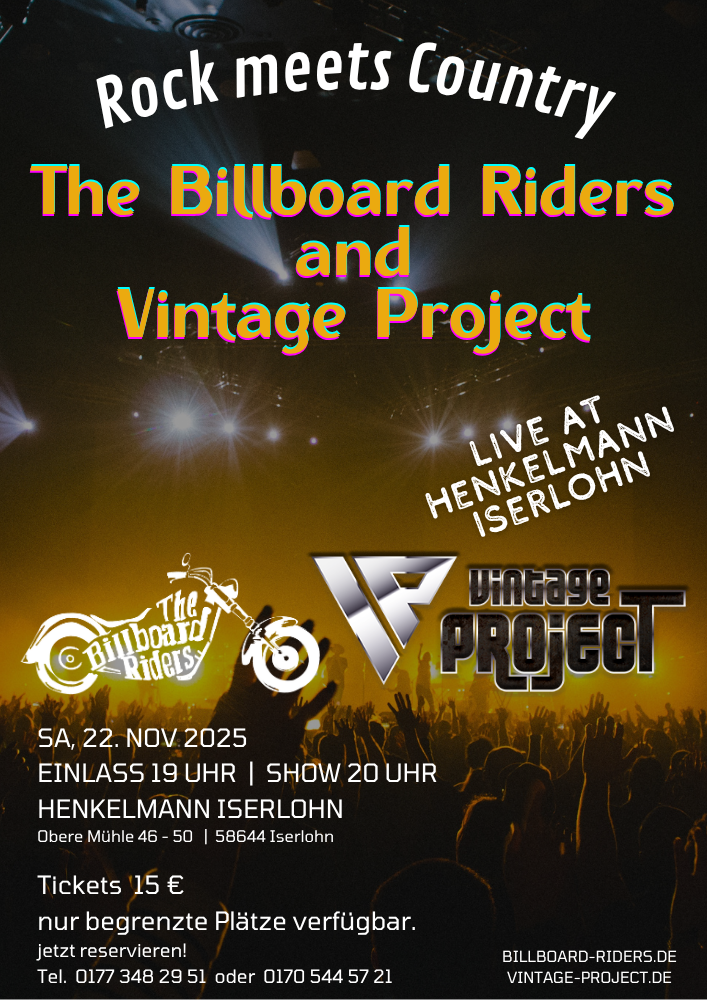 Iserlohn – Am 22. November 2025 wird der Jazzclub Henkelmann zur Bühne für ein musikalisches Highlight der besonderen Art. Unter dem Motto „Rock meets Country" vereinen sich zwei Bands, die gleich doppelt miteinander verbunden sind: Zum einen stehen in beiden Formationen Iserlohner Urgesteine auf der Bühne, zum anderen feierten beide beim 41. Deutschen Rock & Pop Preis beeindruckende Erfolge. Vintage Project sicherte sich in der Kategorie „Bester Rocksong" den 2. Platz, während die Billboard Riders als „Beste Countryband" sogar den 1. Platz nach Iserlohn holten. Diese Erfolge blieben nicht unbemerkt: Der Rat der Stadt lud beide Formationen ins Rathaus ein, um sich persönlich für die herausragende Außendarstellung Iserlohns zu bedanken. Genau dort entstand die Idee zu diesem außergewöhnlichen Heimspiel. An diesem Abend verschmelzen rockige Eigenkompositionen mit coolem New Country Rock'n'Roll aus den amerikanischen Billboard-Charts zu einer abwechslungsreichen und mitreißenden Musikparty.